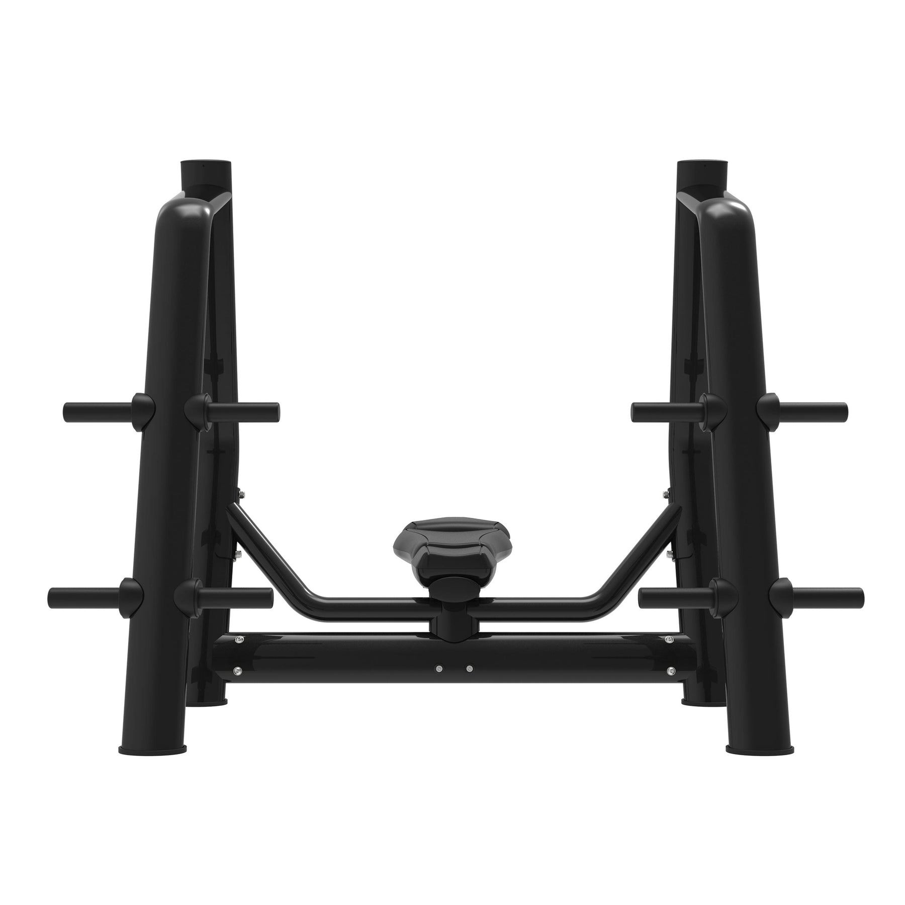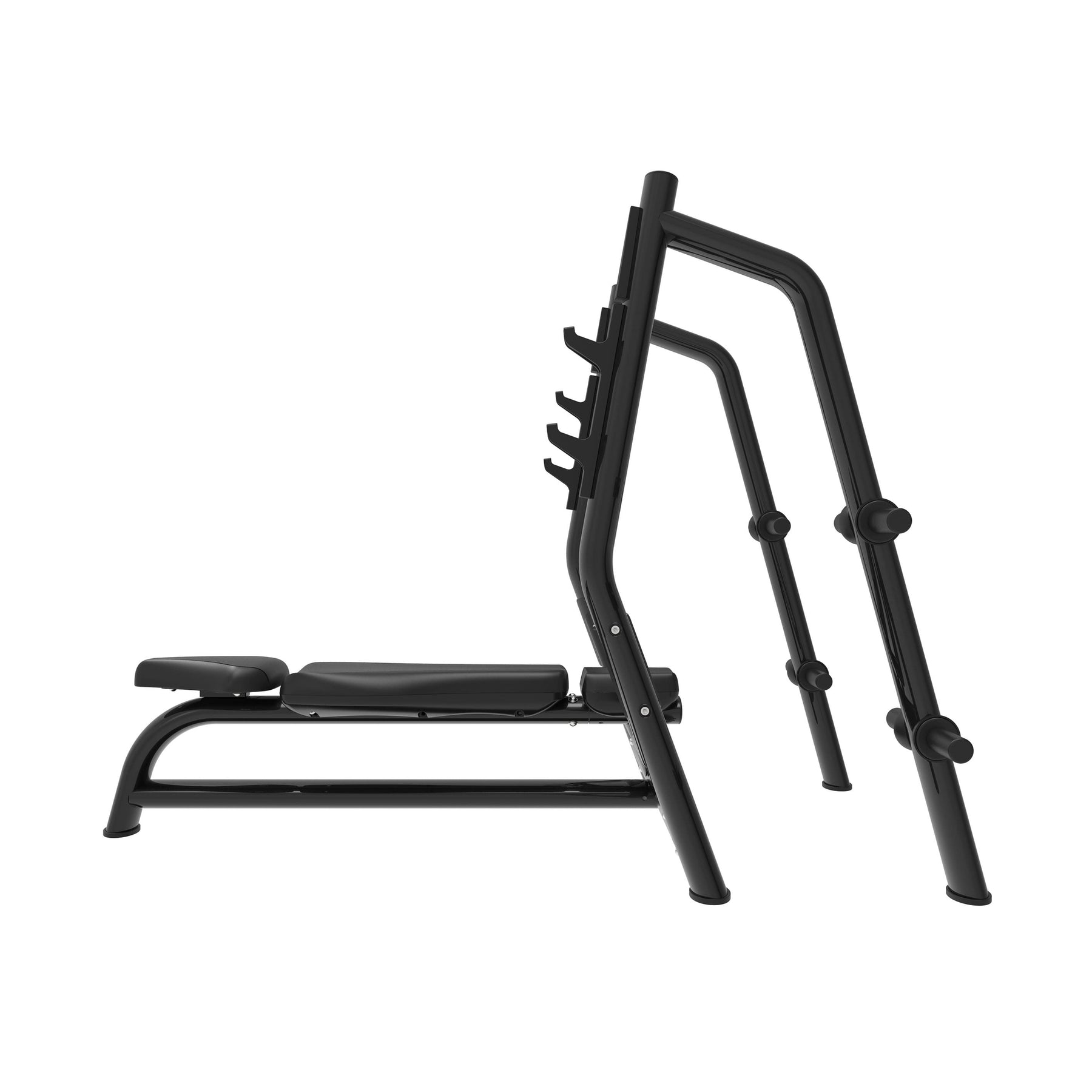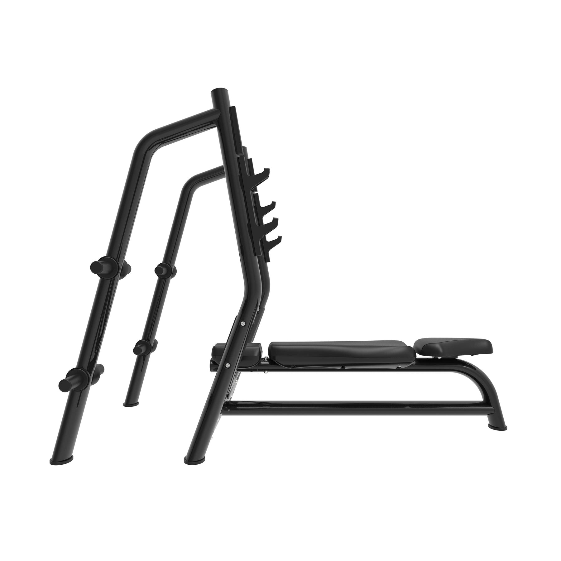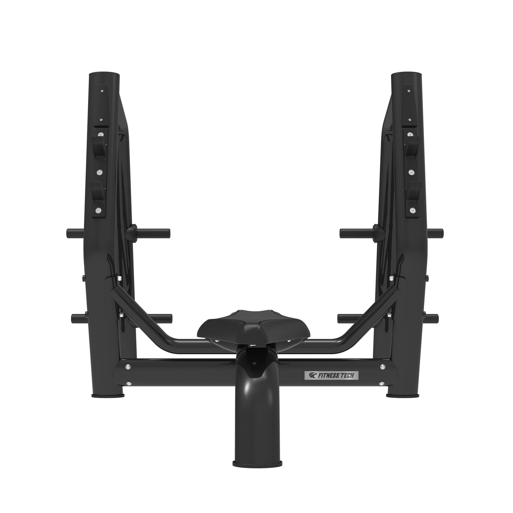 O banco conta com uma superfície completamente plana e um acolchoamento de alta densidade que proporciona firmeza e conforto, permitindo manter uma postura técnica e estável durante todo o movimento. Os suportes da barra, dispostos a diferentes alturas, facilitam um descolagem confortável e um reengate seguro, adaptando-se ao tipo de treino ou à estatura do utilizador. A zona frontal aberta permite a assistência de um spotter, tornando os treinos intensivos mais seguros e eficazes.